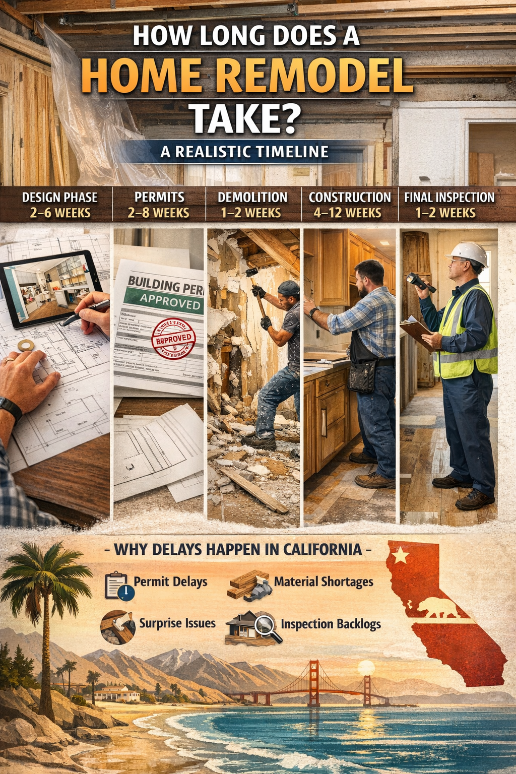 The truth is that remodeling timelines vary depending on many factors such as project size, permits, material availability, and contractor scheduling. In places like California, additional regulations and inspections can also extend the timeline.